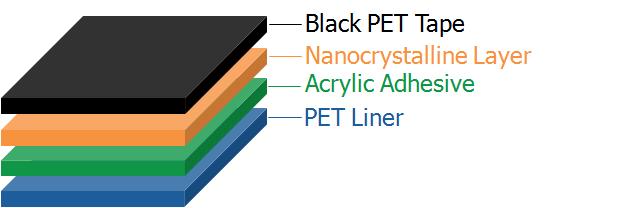 M9001 Series features a nanocrystalline ribbon layer laminated with a pressure sensitive acrylic adhesive. It is a magnetic material that is used to isolate the magnetic flux between the coil and the metal parts in mobile phone, like the battery. By comparing the ferrite, M9001 has better thermal conductivity and higher saturated magnetization which can support high power charging.